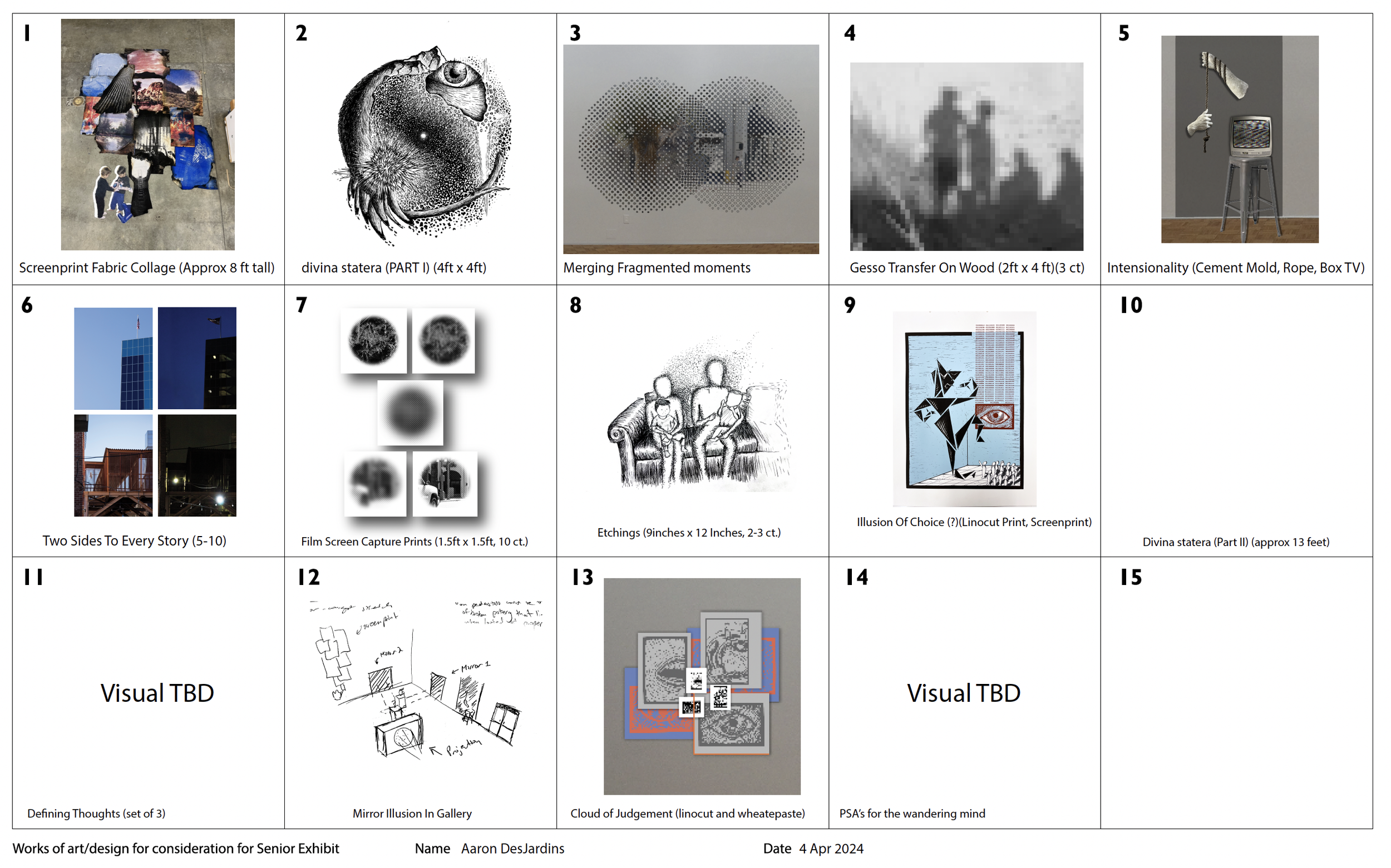 All artwork followed a thorough yet open process of ideation, critique, and revision. Through peer and advisor feedback, multiple versions of each artwork were created and refined into the work presented for the exhibtion.